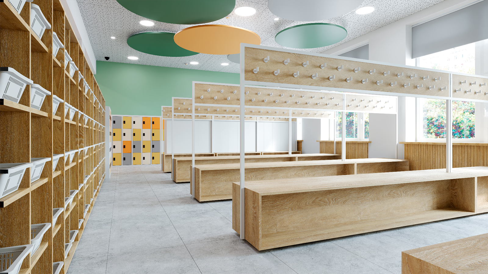 Реализовали зону ресепшен, около 200 шкафчиков для хранения, стойки для фенов, тумбы под раковину