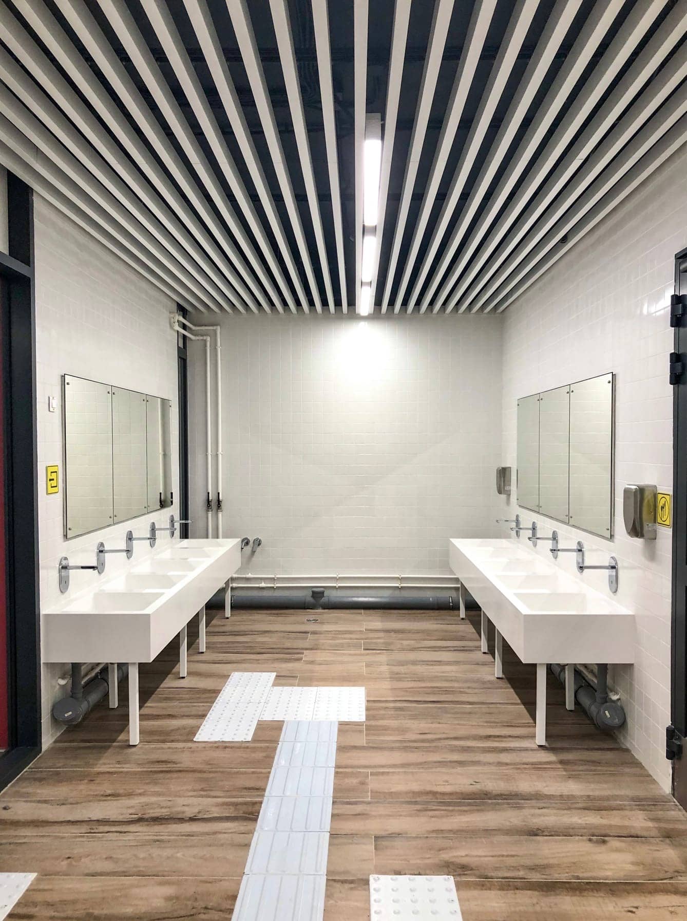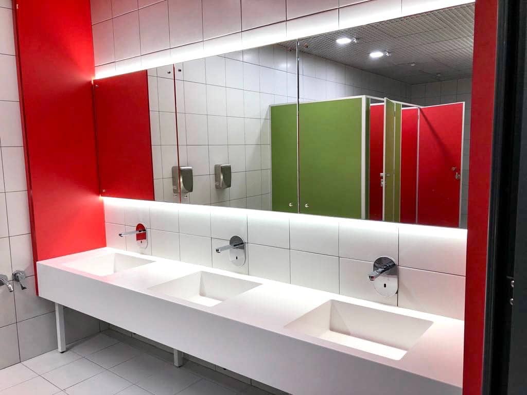 Туалетные комнаты сделаны из самых современных материалов. Каменные трехсекционные интегрированные раковины из листового камня, встроенные