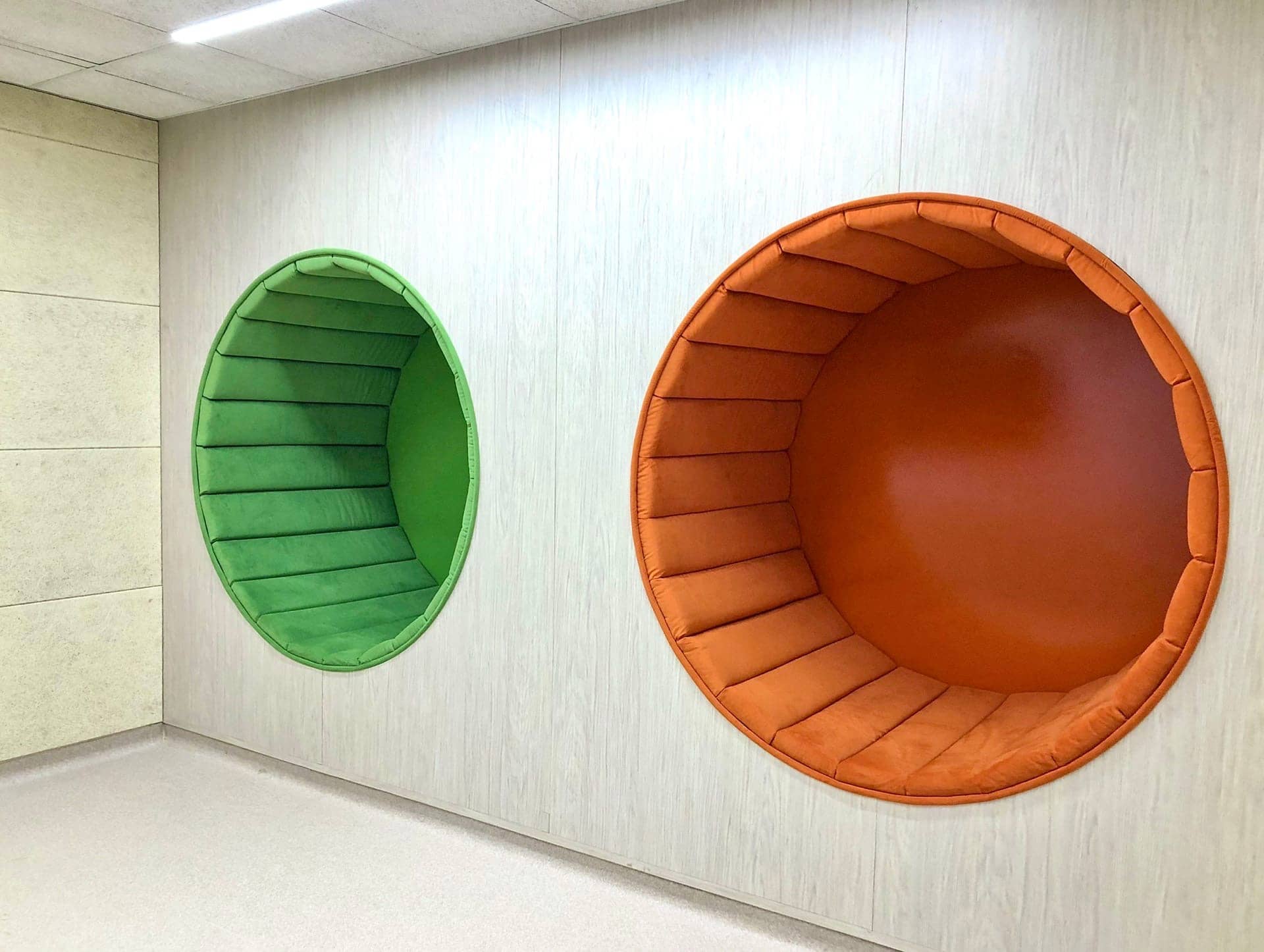 Уютные ниши для отдыха с мягкими цветными стеновыми панелями