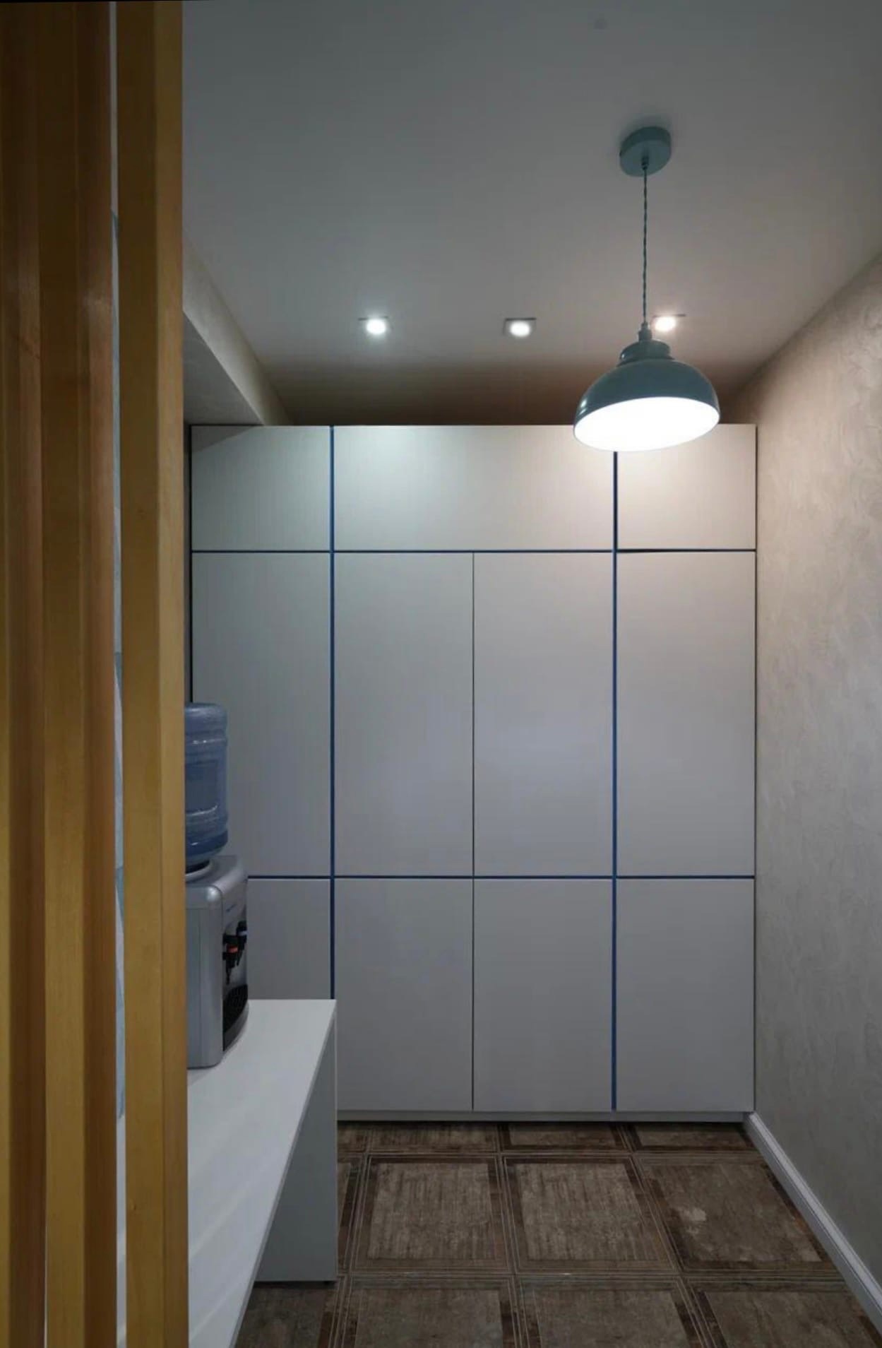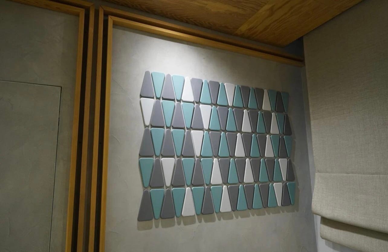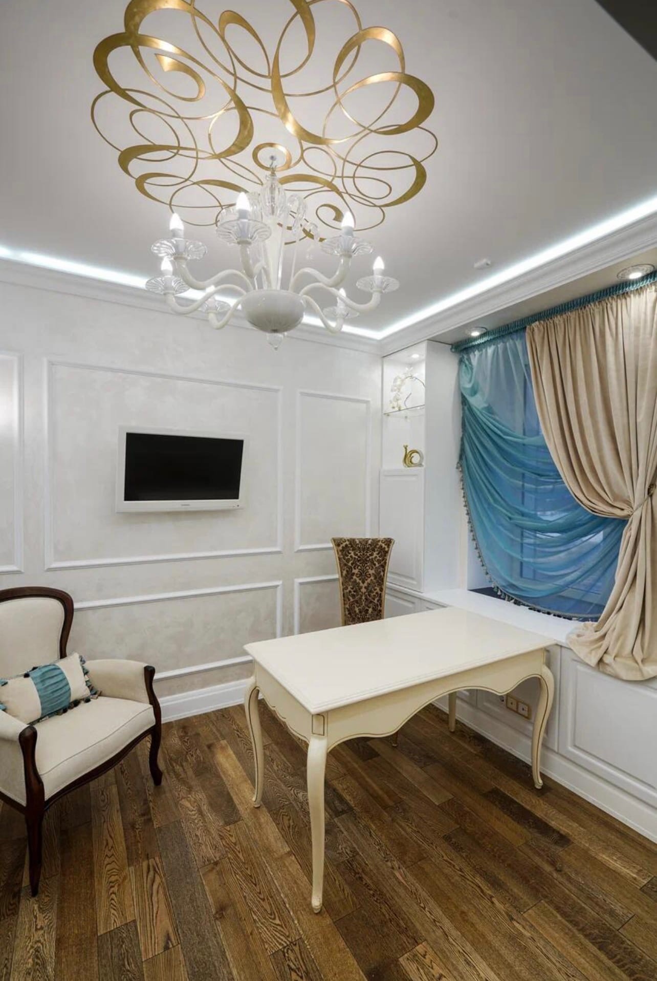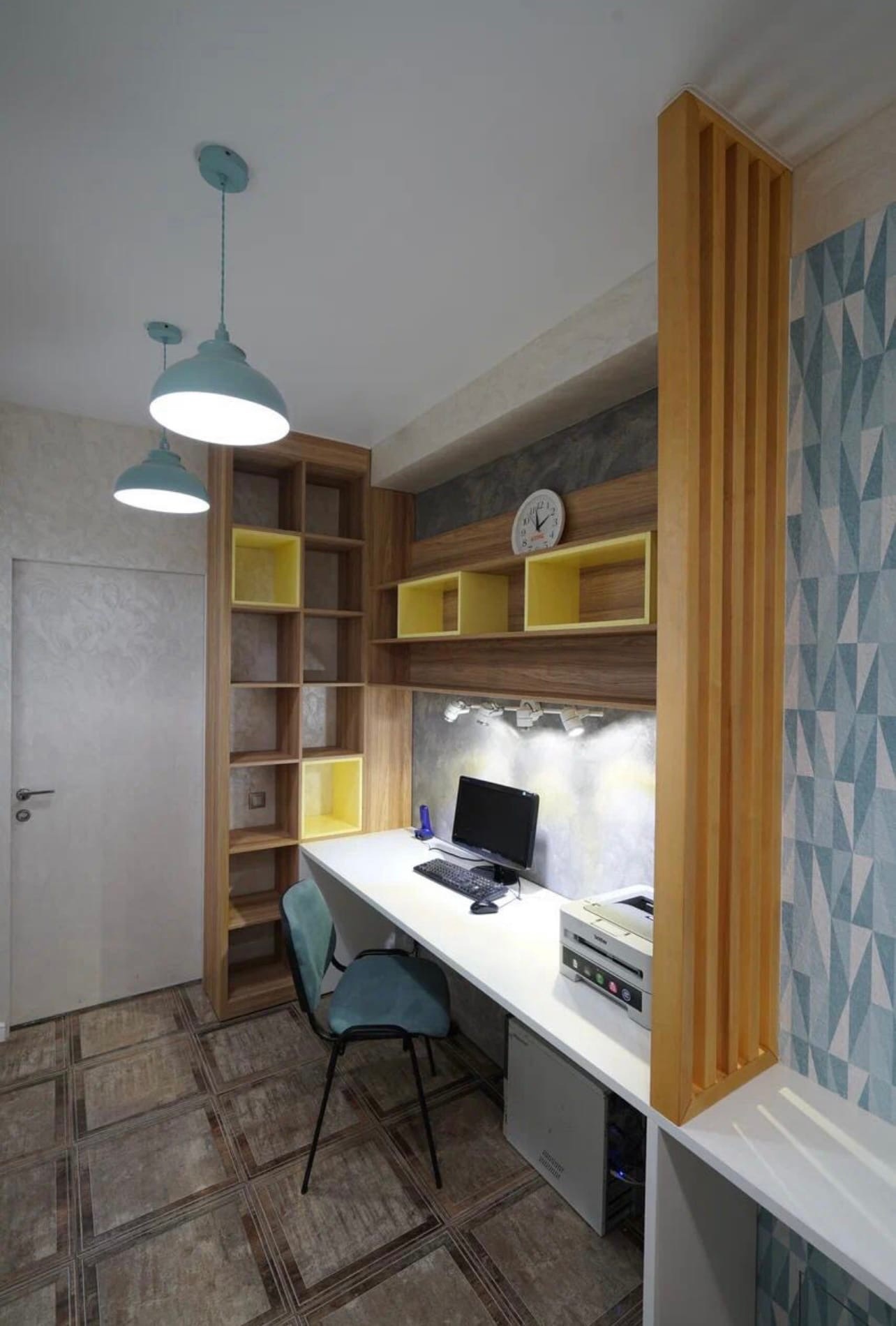 В кабинете руководителя изготовили шкафы-пеналы, которые красиво обрамляют окно, при этом растворяются со стенами кабинета. Пеналы функциональны и привносят изящества кабинету, открытые полки предназначены для размещения декора. Утонченная дизайнерская тумба с декором в виде разноуровневой черепицы.