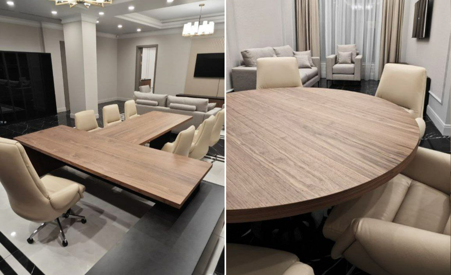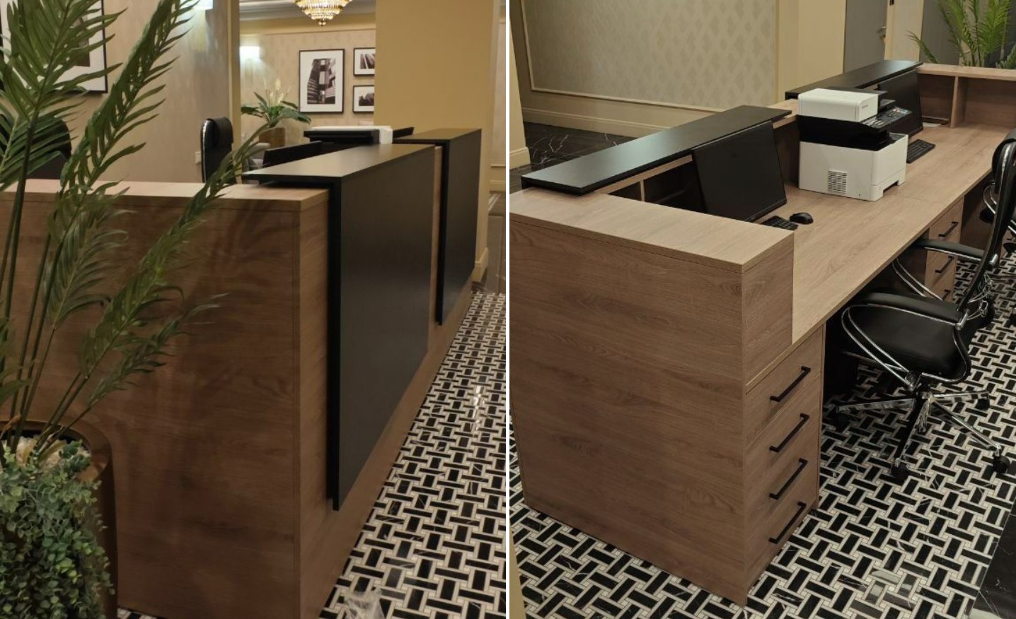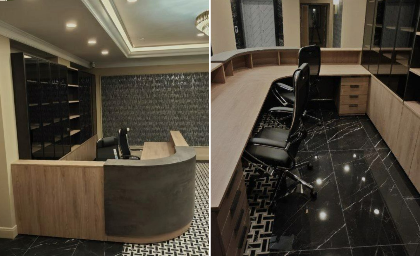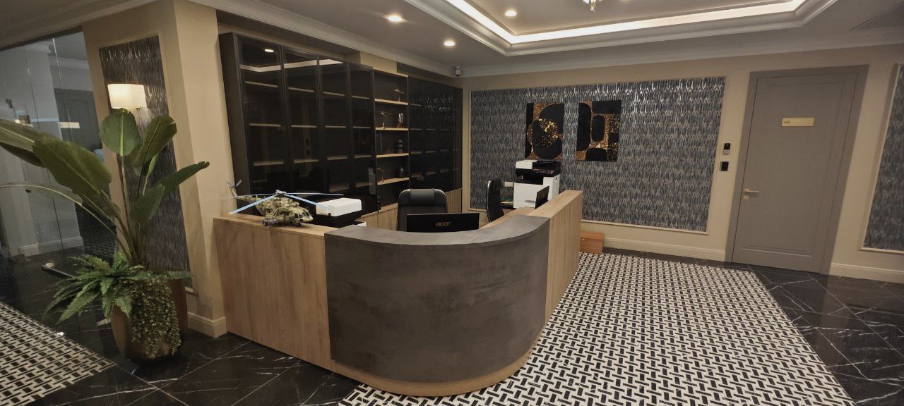 Длительное согласование, связанное с задержкой отделочных работ, сократило сроки изготовления и монтажа. Уже в ходе реализации менялись цели руководства и задачи проекта: сначала требовалась ускоренная установка шпонированных кабинетов руководителей, затем срочный запуск этажей для персонала. Параллельно велась работа над стойками ресепшен, включая специальную конструкцию под большой радиус одной из стоек, чтобы точно вписать ее в архитектуру пространства без потери функциональности и визуальной целостности.