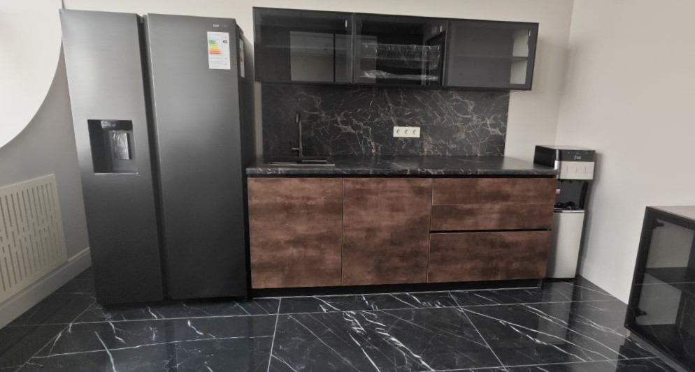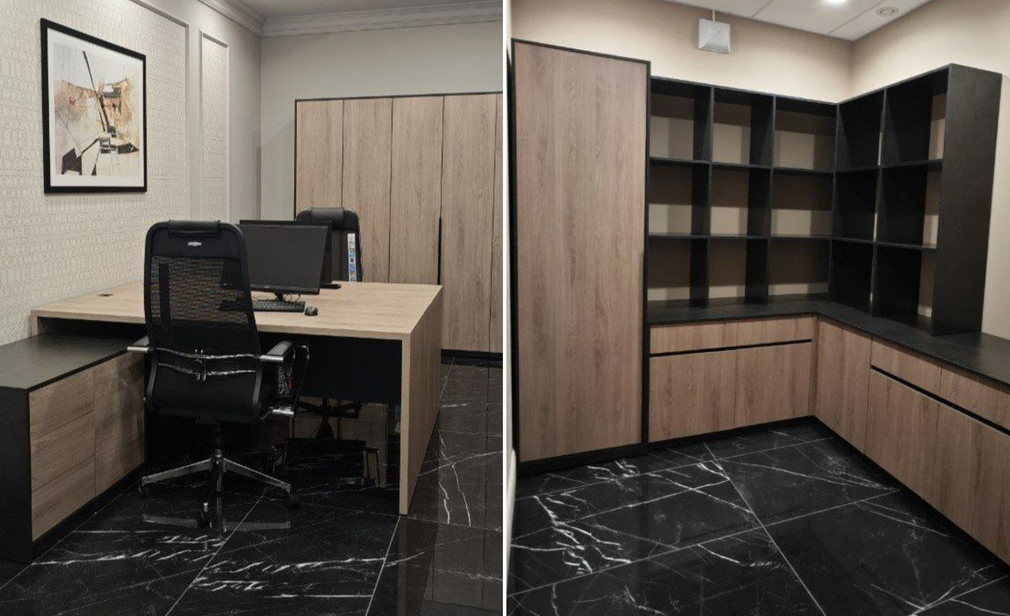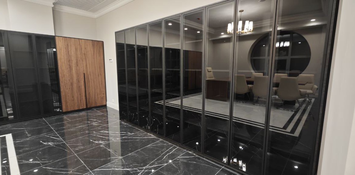 Они выполнены с использованием шпона американского ореха под паркетным лаком, серого стекла в металлической рамке и фурнитуры Hettich. В проекте реализованы сложные индивидуальные решения, включая соединения шпонированных элементов под 45 градусов с переходом рисунка из столешницы в боковину и индивидуальный общий обклад каждого комплекта шкафов. Проект стал результатом слаженной командной работы дизайнера интерьера, отдела снабжения, прораба и исполнителя; отдельная благодарность дизайнеру объекта Майе за доверие и сотрудничество.