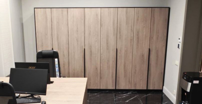 Кабинеты сотрудников и подсобные помещения выполнены из ЛДСП с четким подбором сочетаний оттенков поверхностей, продуманным конструктивом и эргономикой. При этом производителем фасадов был разработан и изготовлен отдельный декор ЛДСП специально для данного проекта, который не представлен в серийной продаже, что подчеркнуло индивидуальный характер проекта.