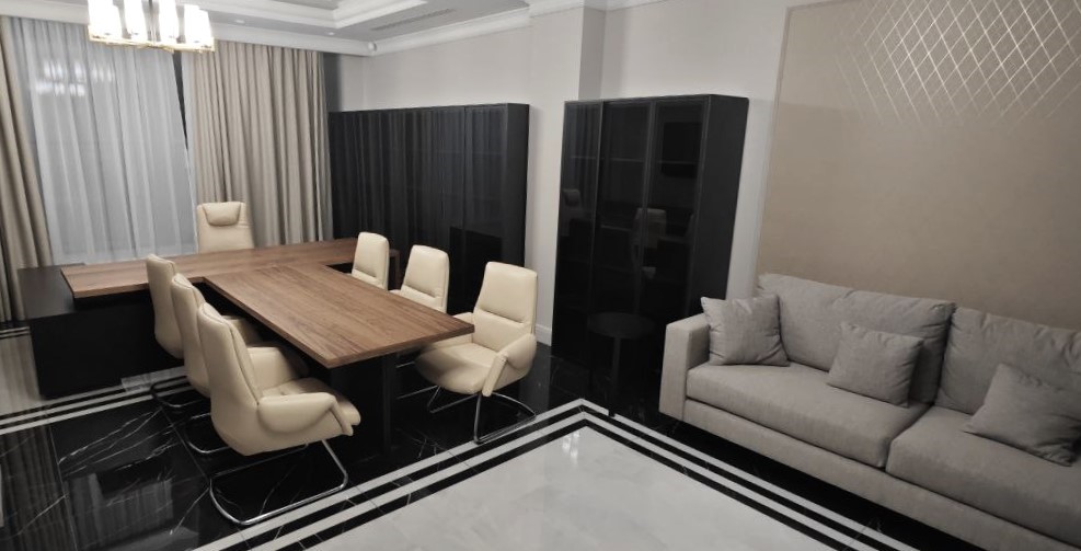 Проект офисного центра начинался с поэтапного согласования, в котором решения принимались комиссионно и покабинетно, с детальной проработкой каждого элемента мебели. До начала серийного производства был изготовлен экспериментальный образец одного из кабинетов, что позволило утвердить все конструктивные, визуальные и технологические решения.